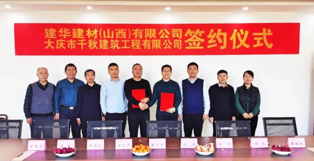 近日,建华建材(山西)有限公司与大庆市千秋建筑工程有限公司(以下简称千秋建筑)就万秋新型建材有限公司股权转让合作事宜举行了签约仪式。