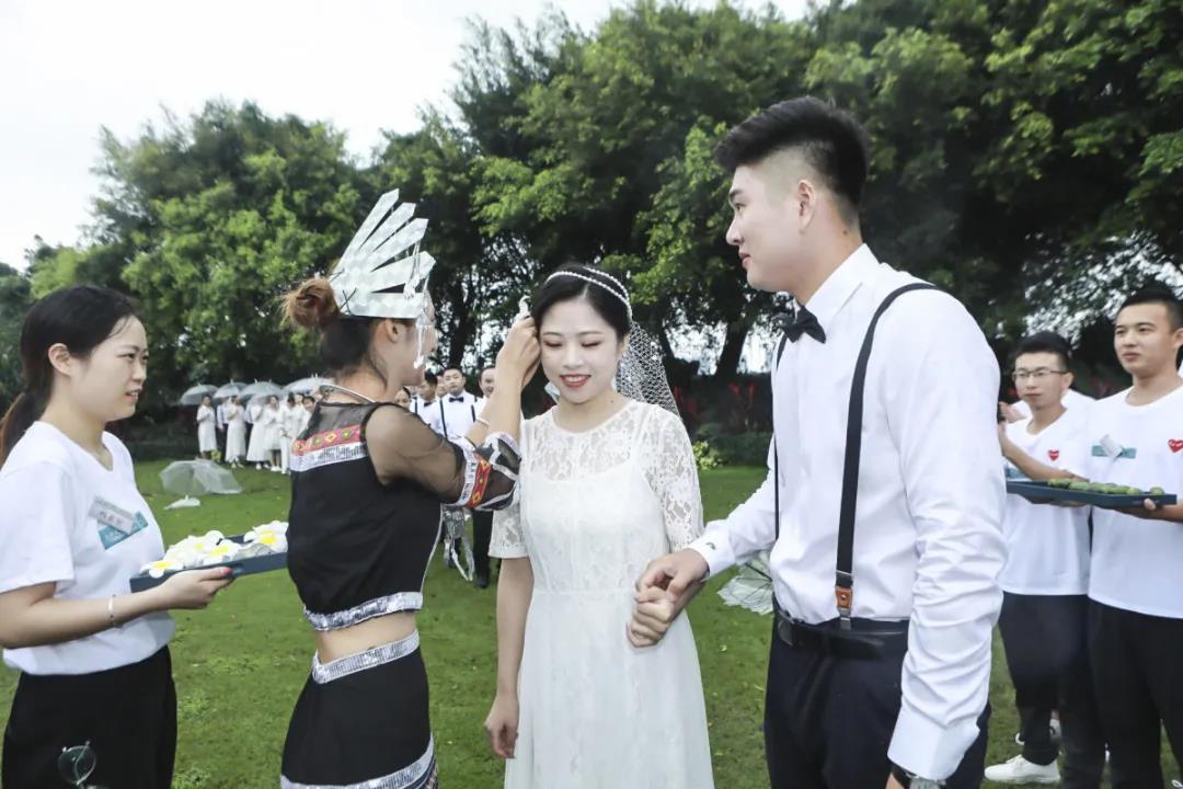上午9点08分,30对新人在别具风情的黎族欢迎仪式中开启了浪漫的求婚之旅,热情欢快的竹竿舞、青春洋溢的快闪舞蹈,将现场欢乐气氛推向高潮。