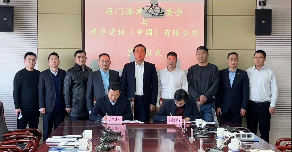 在海门区和建华建材集团相关领导的共同见证下,海门港新区主任朱健华和建华建材集团总裁助理郑赛荣作为双方代表,共同签署了项目合作协议。