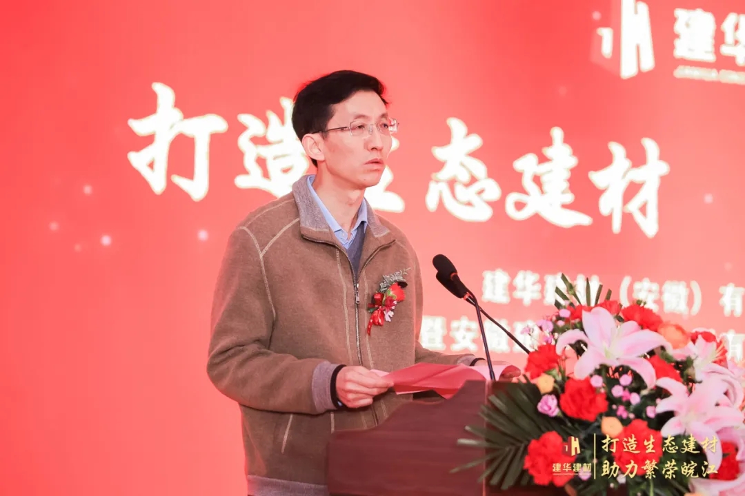 王刚董事长代表集团致辞,他表示安徽建华实现全线投产,同时建华创投试产成功,是建华建材集团在优化产业结构、深化转型升级战略布局中迈出的关键一步。安徽建华要充分发挥上下游产业链优势,全力将安徽建华打造成建华建材集团在长三角地区产品供应的“后花园”、“子弹库”。